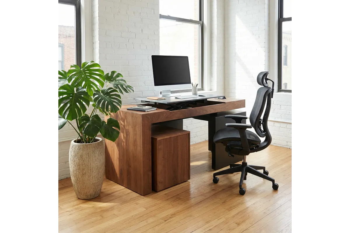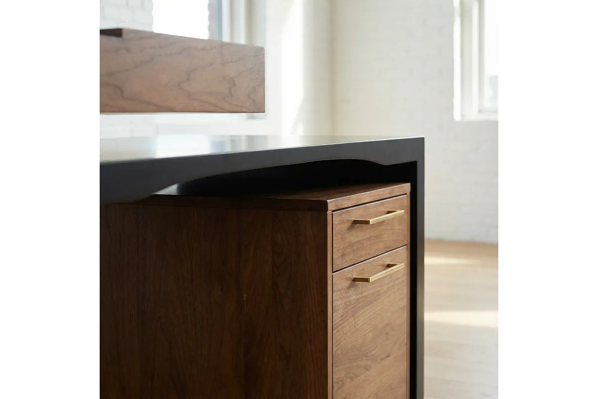 Furthermore, the optional Smart File enhances the desk's functionality. Measuring 20 inches wide, 17 inches deep, and 21 inches high, this storage unit complements the desk with matching walnut construction and OCS-105 Black Walnut Stain. Equipped with heavy-duty twin wheel casters for mobility, it also offers full extension soft close undermount slides, and is available in a stationary version for those who do not require mobility.