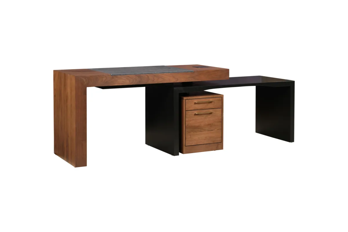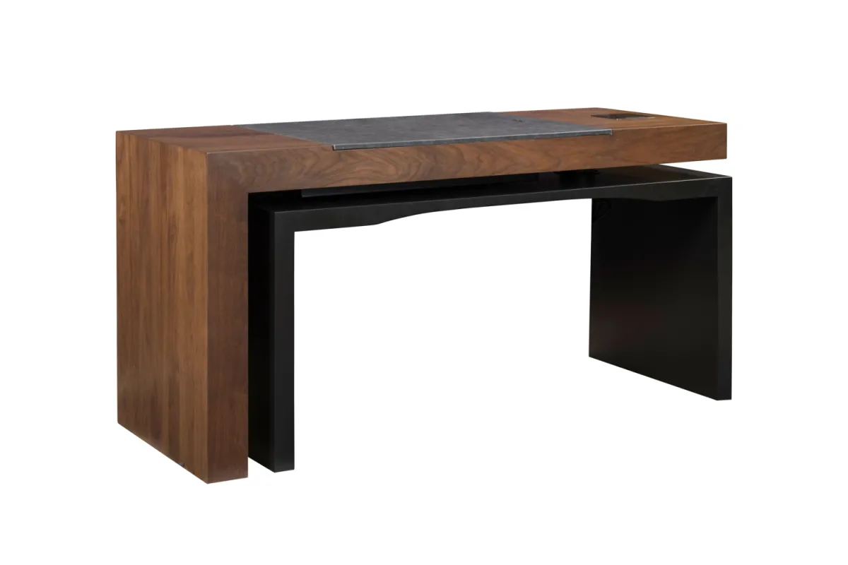 20% OffThe Smart Desk is a sophisticated office table meticulously designed to enhance any professional workspace. Constructed with top-quality materials, including a walnut top finished with an OCS-105 Black Walnut Stain and a base crafted from Brown Maple featuring a Black Paint 10 Sheen, this desk exudes both elegance and durability. Seamlessly incorporating a writing pad made from L130 Night Sky Leather, it provides an exquisite, soft-touch surface for writing and other tasks.