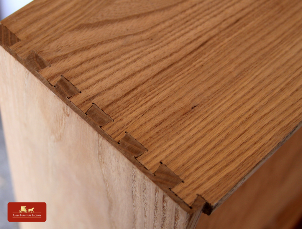 You’ll often see hand-cut dovetails in Amish drawers and cases because they’re super strong, especially when pulled. The angled shape locks the joint tight, making it nearly impossible to pull apart. For a cleaner look, half-blind dovetails hide the joints at the front, while through dovetails at the back add extra strength. The solid wood drawer bottoms sit in grooves that allow for some movement with humidity, preventing cracking or warping. The best have the grain running side to side with a little extra space at the back to expand easily.