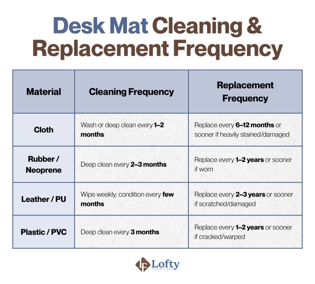 How often you should clean or replace your desk mat depends on its material, how frequently you use it, and the environment it’s in. Cloth mats tend to absorb oils and stains more quickly, requiring more frequent deep cleaning, while rubber or neoprene mats are more resilient but still need periodic maintenance to prevent buildup. Leather and PU leather respond better to gentle, routine care to preserve their finish, and plastic or PVC mats benefit from regular sanitation to avoid discoloration or warping.