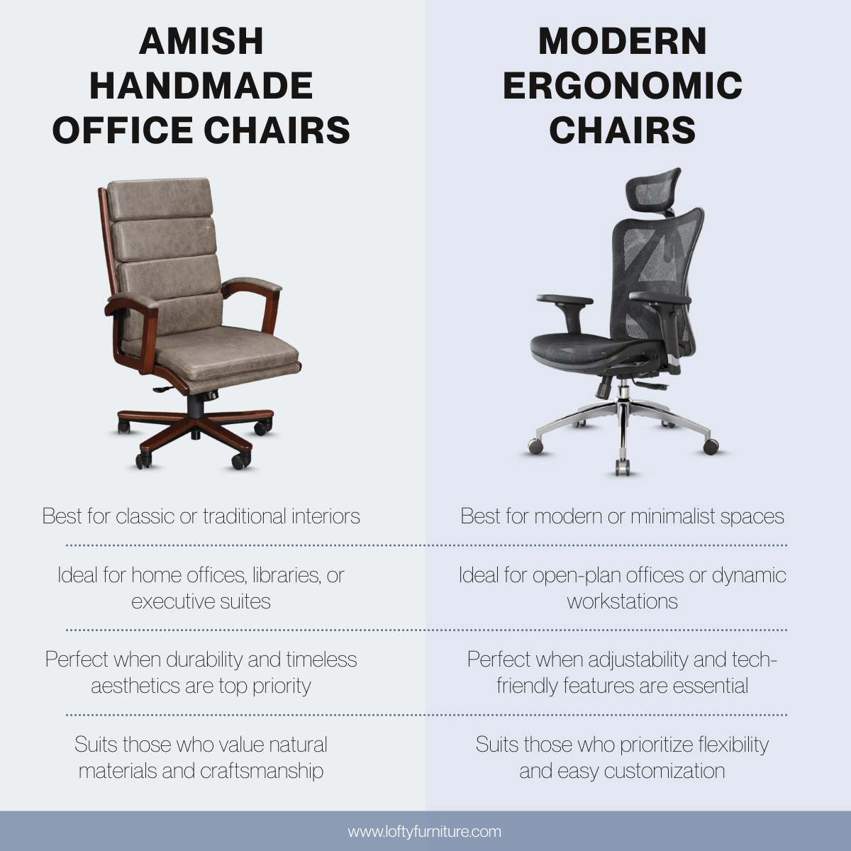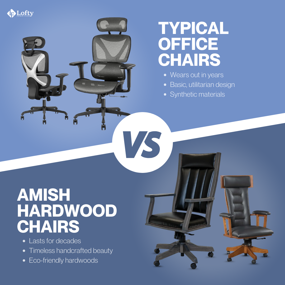 Lofty Furniture is your one-stop destination for ergonomic office essentials. We specialize in producing adjustable-height desks, adorned with exquisitely crafted Amish-made tops, and pairing them with top-notch ergonomic chairs and coordinating accessories.